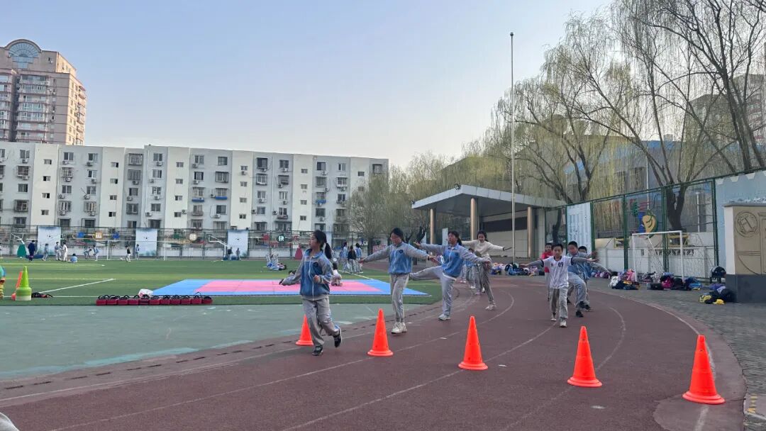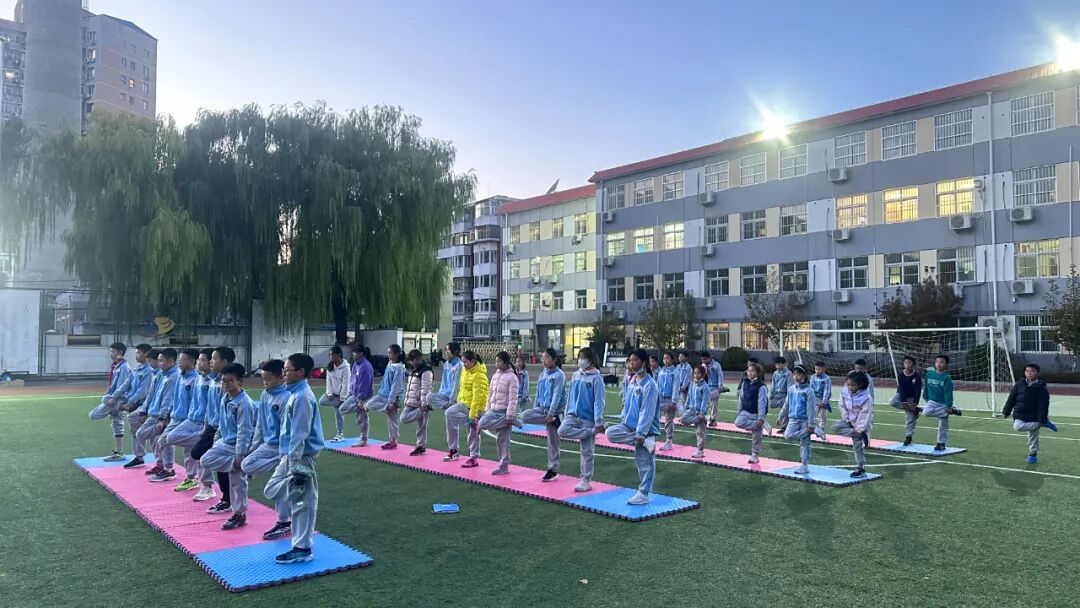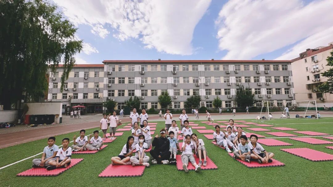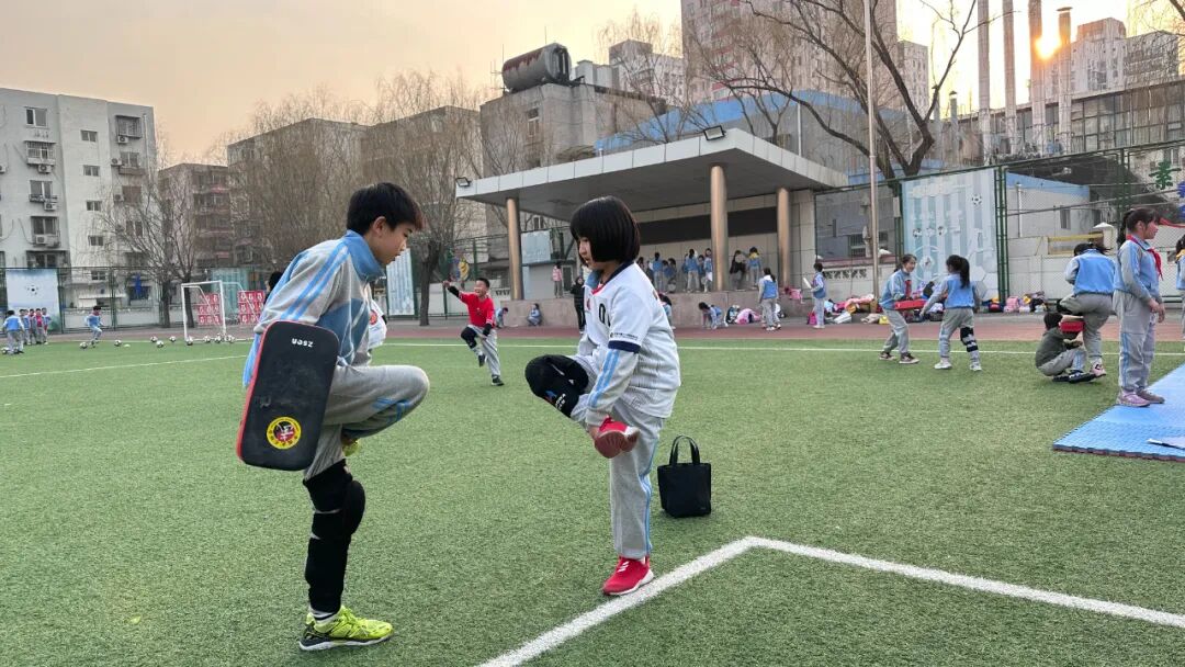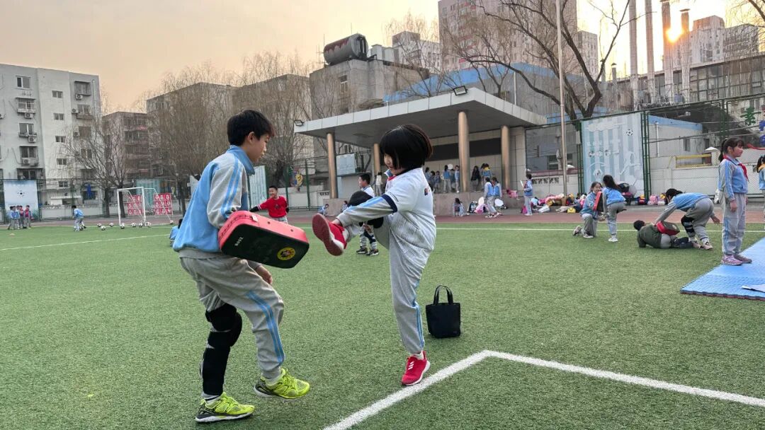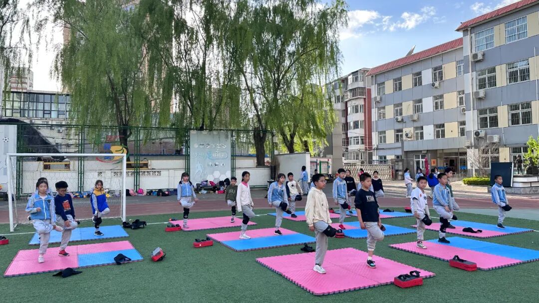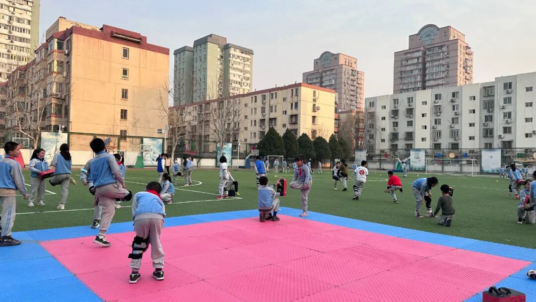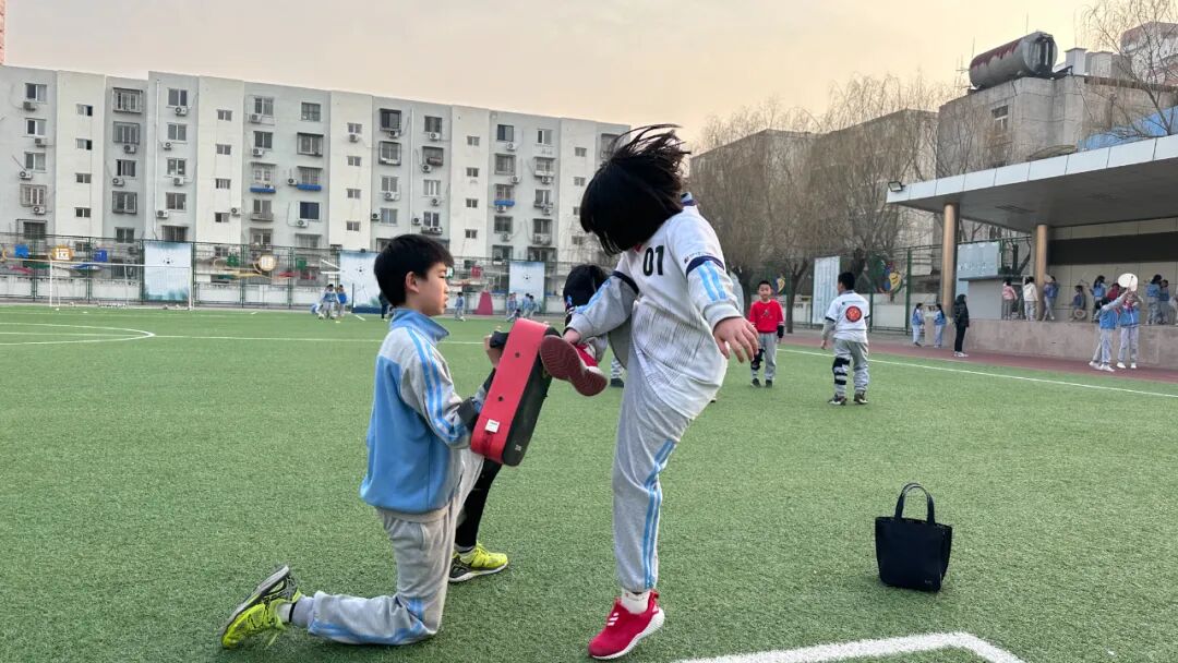 午后的阳光照射在体育场的绿荫草坪与跑道上,洒在二十几个孩子汗津津的脸上。他们两两对峙,单脚支撑,另一腿屈膝抬起,双手紧握脚踝,在教练的口令下进行着一次又一次灵活的步伐移动和有策略的对抗练习,这是北京市第八十中学枣营分校脚斗娃社团活动日常训练的场景。看似简单的动作背后,也是北京市第八十中学枣营分校脚斗娃社团五年来不简单的成长故事。